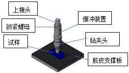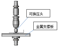 3)夹具功能说明(下部支撑直接用大面积金属支撑板和胶皮支撑板各一块,面积250mm×250mm,保留缓冲装置(缓冲装置安装于上压头),如果客户不需要缓冲装置时,可以锁紧去掉缓冲功能,添加一个垫块40mm×40mm×5mm直接放置在大面积支撑板上)